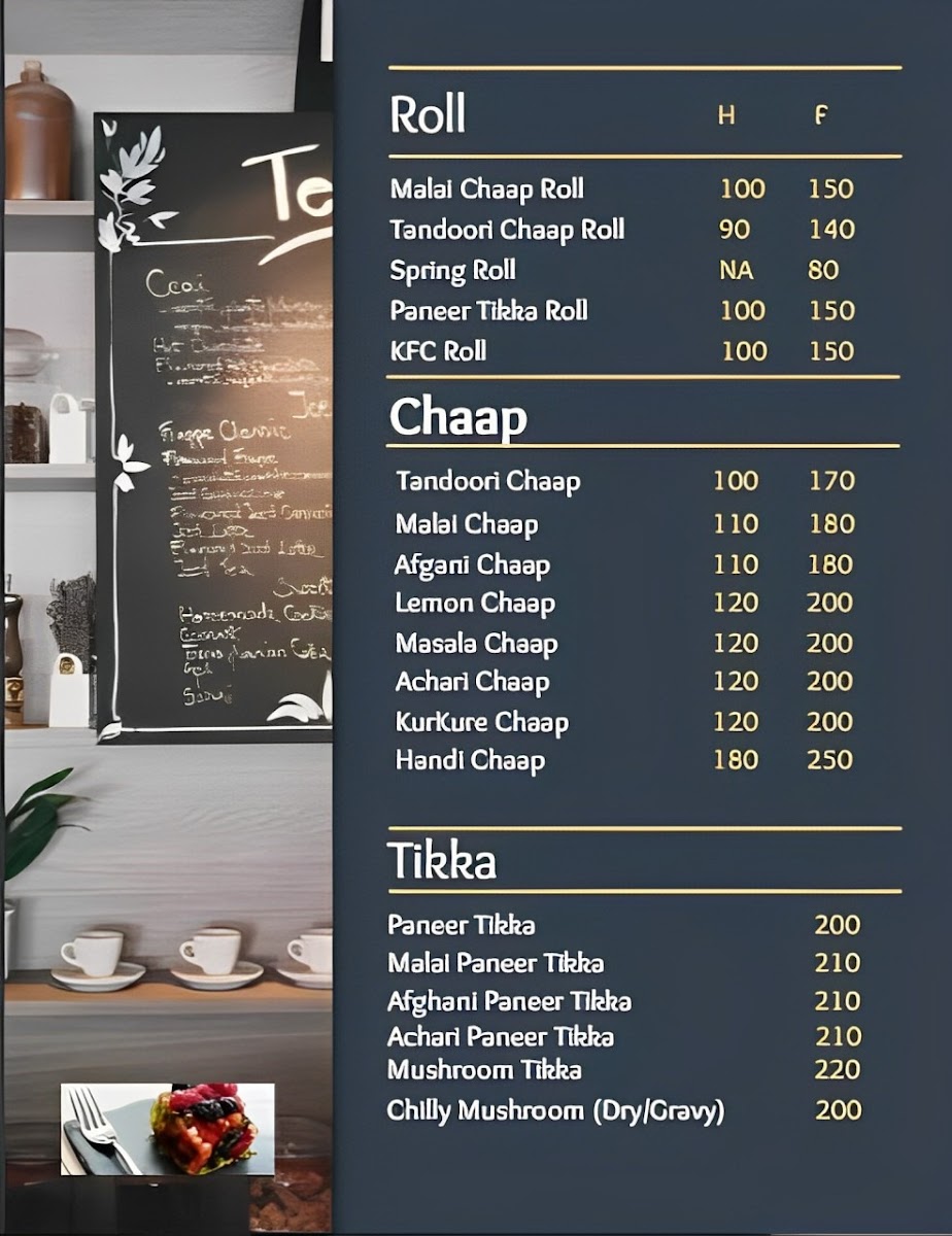 The menu is a delightful mix, featuring signature items like the Malai Chaap Roll (₹100) and Tandoori Chaap Roll (₹90), perfect for those on the go. For those craving something crunchy, the Spring Rolls (₹80) stand out with their crispy exterior and flavorful filling.